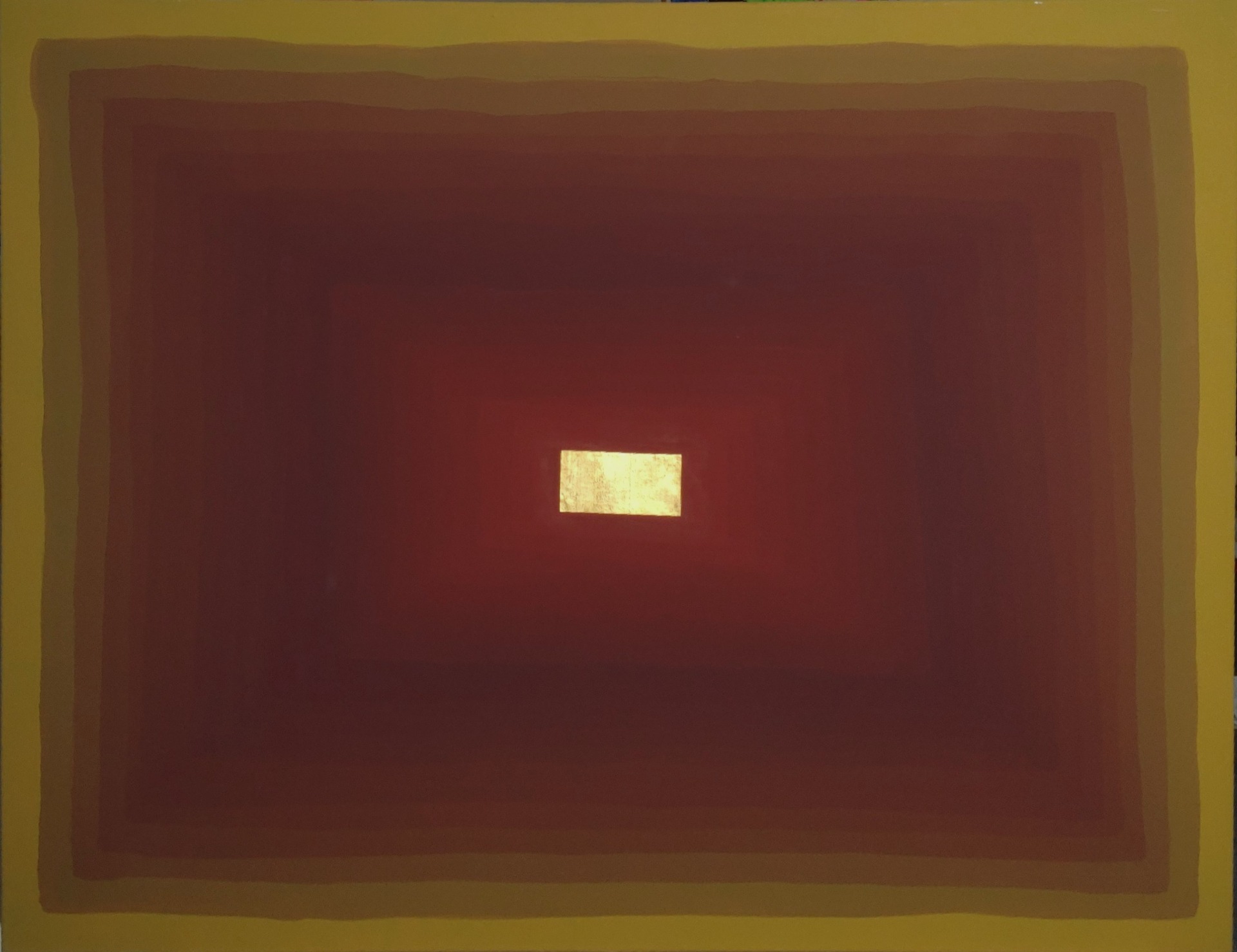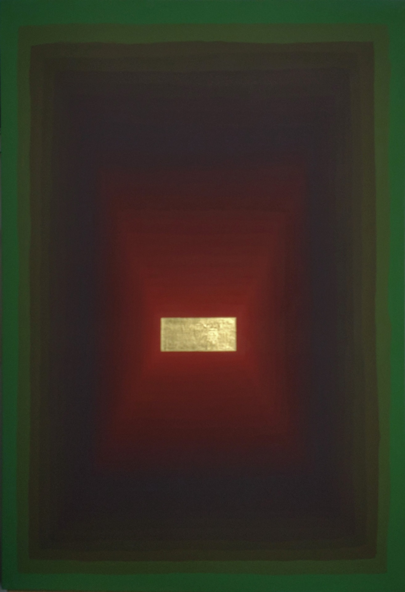 examines how economic narratives concentrate meaning, value, and attention toward a central point. The paintings unfold through receding color fields that gradually contract inward, producing a sense of spatial pull reminiscent of a tunnel, a waveform, or a directional signal. Patterns emerge through repetition, subtle modulation, and accumulative change, guiding perception toward coherence without overt assertion.
