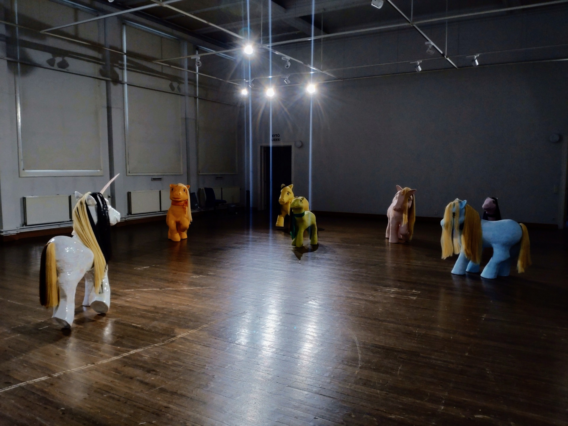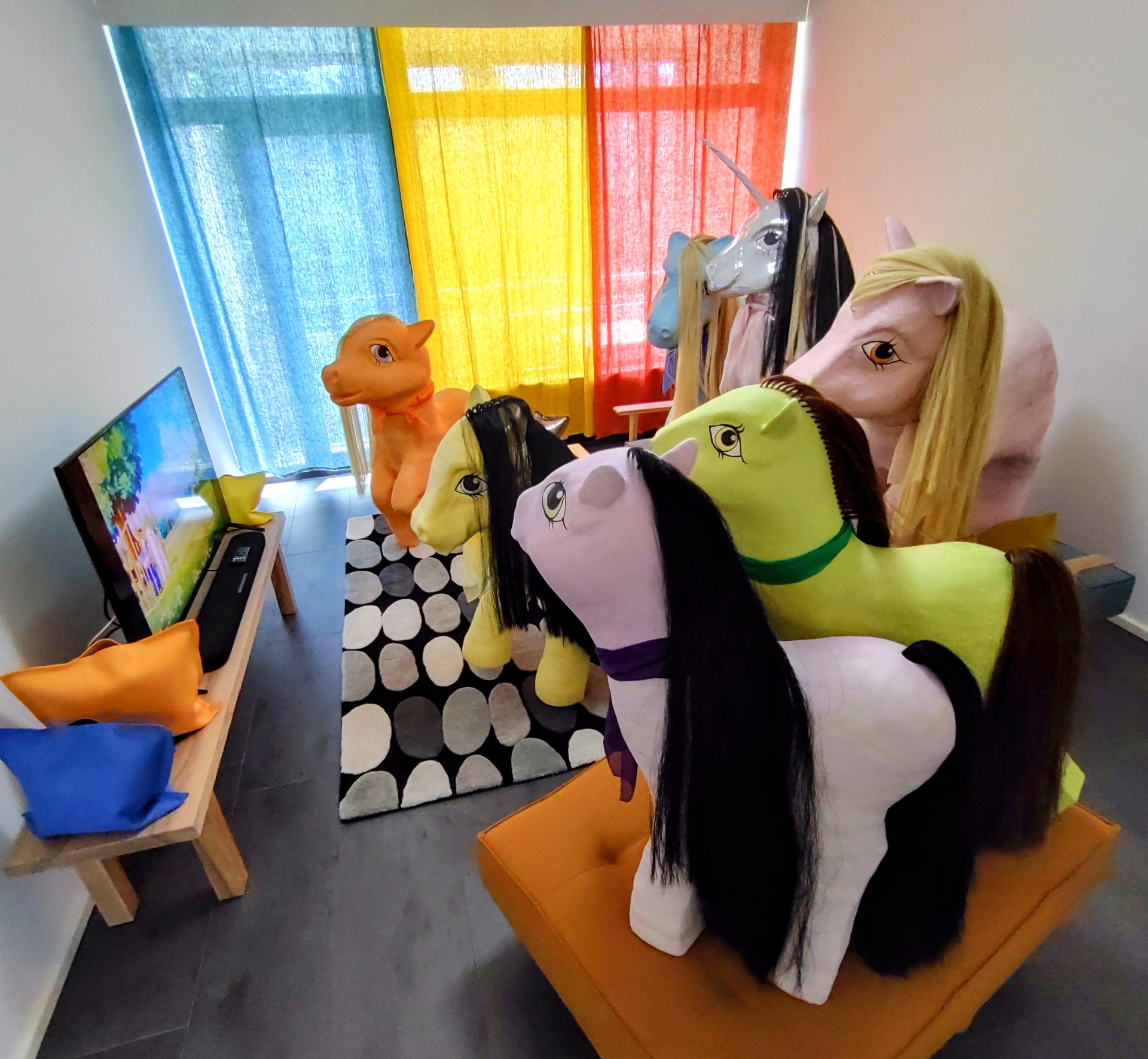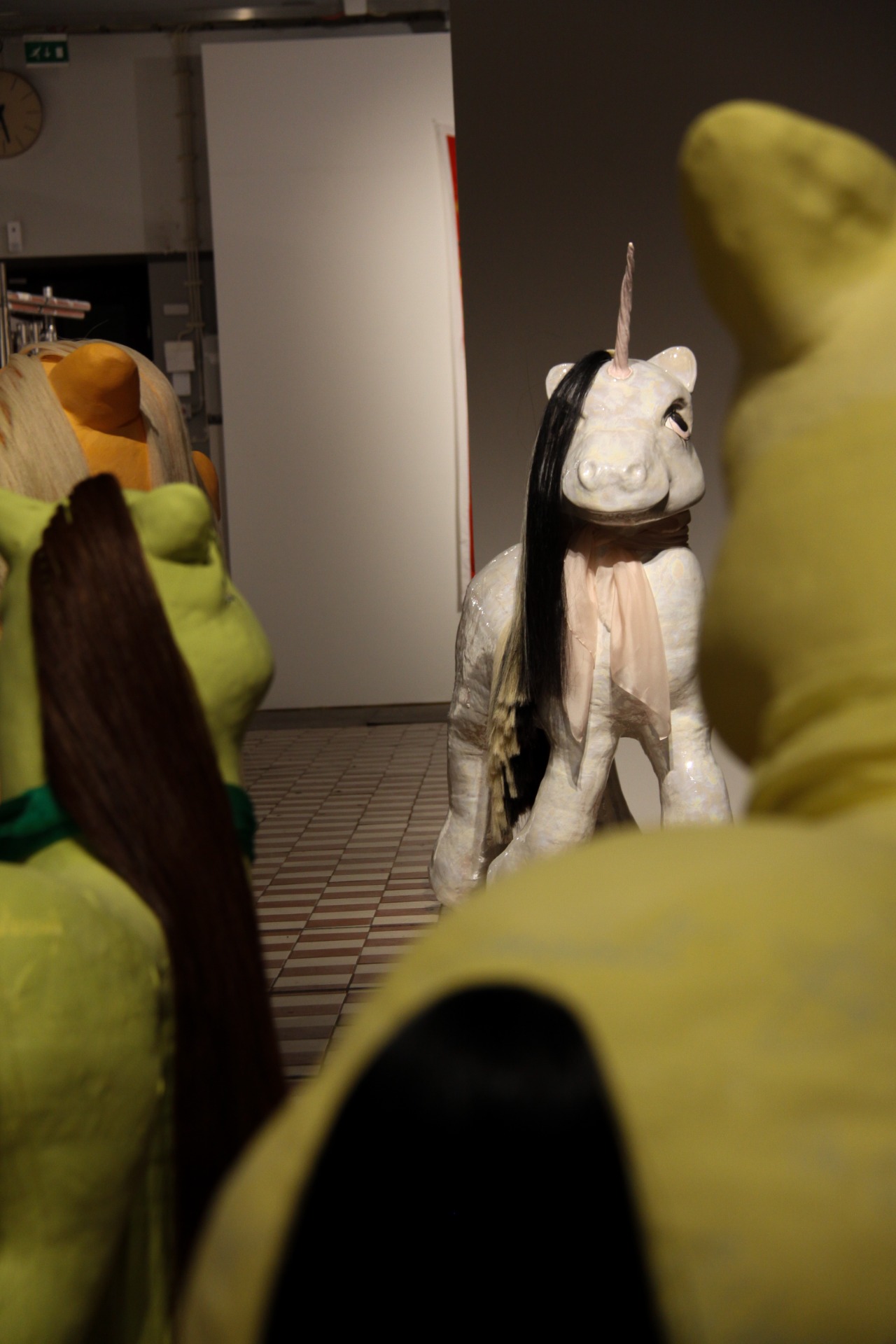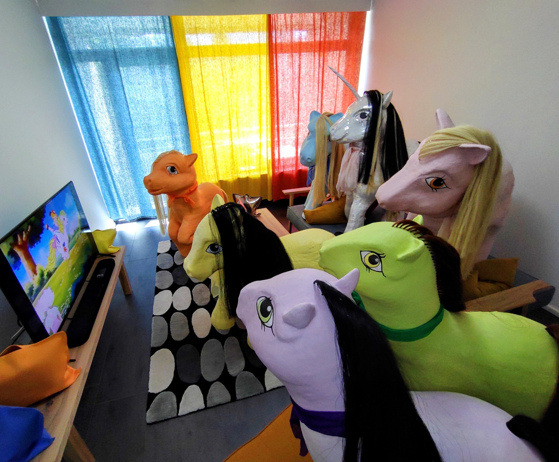 [C'mon, Follow Me Across the Rainbow and I'll Show You the Way to the Dream Valley. Height at the withers varies from ca. 60 cm to ca. 90 cm. Stoneware, engobes, clear glaze, pearl lustre, horsehair, silk. 1200 °C, oxygen, 2022.]